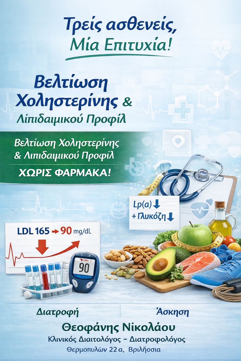 Στις αρχές Σεπτεμβρίου 2025, τρεις διαιτώμενοι ξεκίνησαν συνεργασία στο πλαίσιο διατροφικής παρέμβασης με στόχο τη βελτίωση του λιπιδαιμικού τους προφίλ, έχοντας προηγουμένως μελετήσει το επαγγελματικό μου υπόβαθρο και τα αποτελέσματα που έχουν επιτευχθεί διαχρονικά στον έλεγχο των λιπιδίων του αίματος.